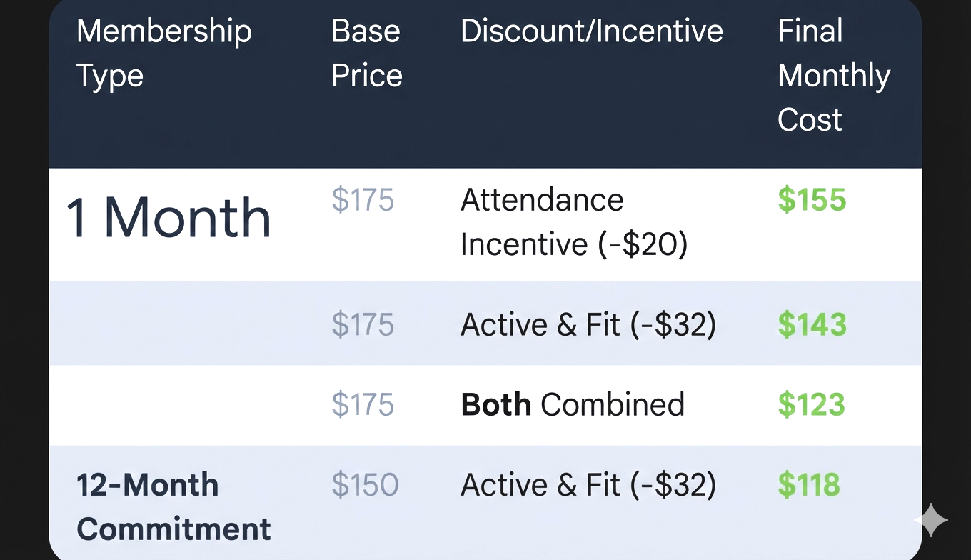 You can decrease the cost of your membership by using the attendance incentive, Active & Fit, Your HSA, or maybe all 3! For more info, checkout the “Insurance” page.
